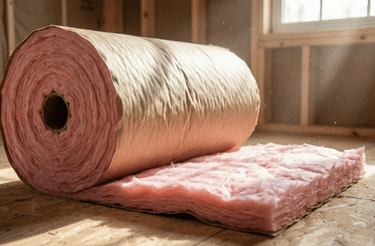 Every stud bay is filled with vibrant pink insulation, perfectly fitted without gaps or compression.